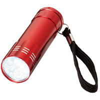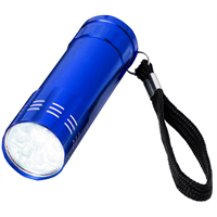 Zaklamp met 9 heldere LEDs. Polsriempje, aan-/uit-drukknop aan de achterkant. Werkt op 3 AAA-batterijen. Aluminium.