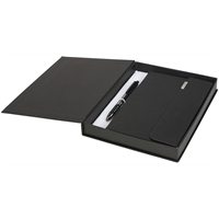 Notitieboek met 80 pagina’s van 80 gram gelinieerd papier en een handig opbergvak voor losse notities achterin. Dubbele elastiek, paginalint en pen lus. Geleverd in een geschenkverpakking. PU Plastic.