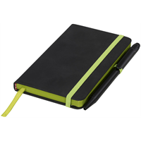 Nieuwe toevoeging aan ons populaire assortiment notebooks. Deze veelzijdige nieuwe notebook heeft een gladde zwarte PU-cover, met felgekleurde dikke ringband en bijpassende pennenlus. Inclusief 160 vel (70 g / m2) crèmekleurig papier. PU Plastic, Metaal.