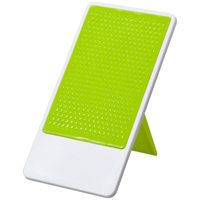 Telefoonhouder met inklapbare standaard en plakrand voor op het bureau. Plastic.